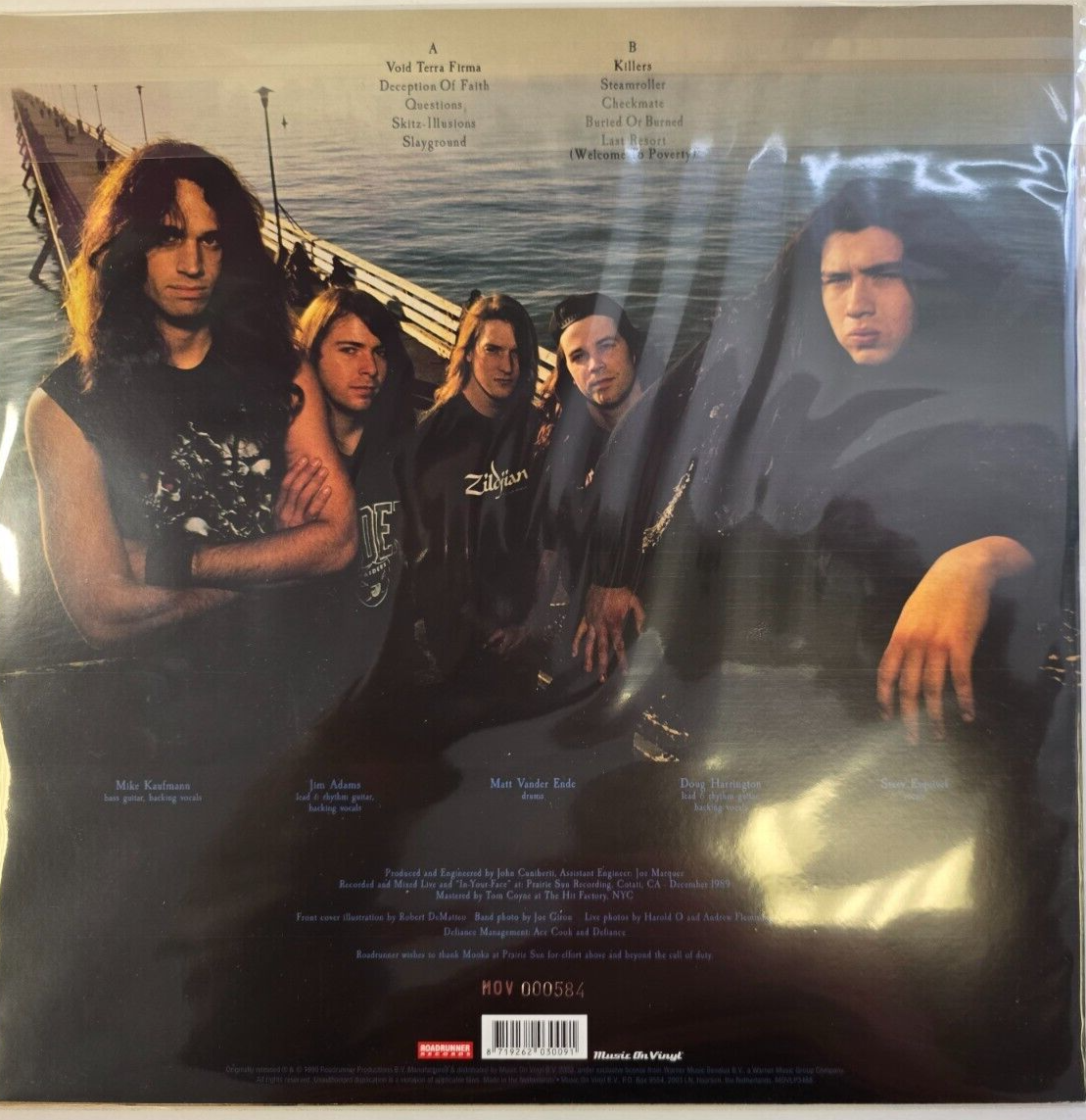 Void Terra Firma was Defiance's second studio album and first album with new singer Steev Esquivel. Defiance belonged to the San Francisco Bay Area thrash scene that gave us bands such as Testament, Exodus, Forbidden, and Death Angel. This is Bay Area thrash at its finest, listen to standouts tracks like the title track, "Skitz-Illusions," and "Last Resort (Welcome to Poverty)" for some mighty fine examples of that sound. The record also contains a cover of Iron Maiden's "Killers". The seemingly telepathic connection between the rhythm and lead guitarists sounds phenomenal and newcomer Esquivel also steps up to the plate on this one. Void Terra Firma is available as a limited edition of 1000 individually numbered copies on red & black marbled vinyl and includes an insert with lyrics. 180 gram audiophile vinyl Includes insert with lyrics First album with vocalist Steev Esquivel Limited edition of 1000 individually numbered copies on red and black marbled vinyl