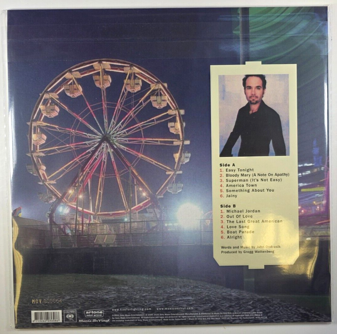 America Town is the second studio album by singer-songwriter Five for Fighting, originally released in 2000. This 2025 limited edition vinyl LP reissue is pressed on 180-gram translucent blue vinyl. The album is a career-defining work, featuring the hit singles "Superman (It's Not Easy)" and "Easy Town," and is known for its blend of piano-driven rock, thoughtful lyrics, and memorable melodies.