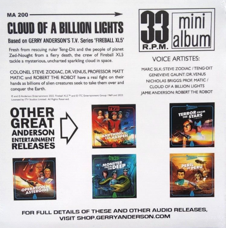 Cloud of a Billion Lights is a limited edition 7" mini-album featuring audio drama content from Gerry Anderson’s Fireball XL5. Originally included in the Fireball XL5 Deluxe Blu-ray Box Set, this standalone release features two parts of the story on a vibrant opaque yellow vinyl disc. Issued in a side-opening sleeve with die-cut white paper inner, this collectible edition is a must-have for fans of classic British sci-fi and Anderson’s iconic Supermarionation series.