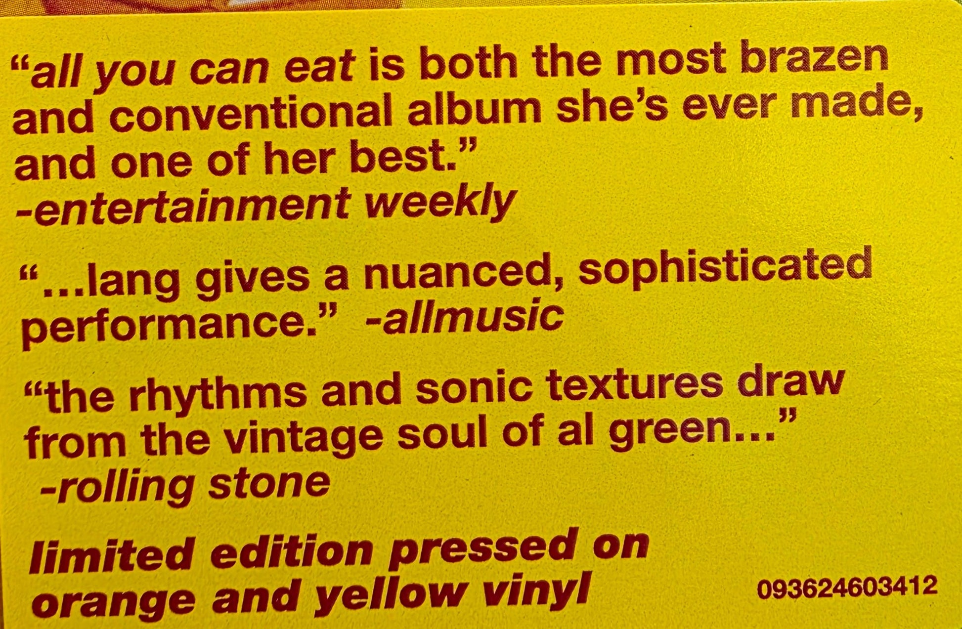 Immerse yourself in the nuanced and sophisticated sounds of KD Lang's 'All You Can Eat.' Praised by critics, this album is described as both brazen and conventional, showcasing Lang's ability to draw from the vintage soul of Al Green. This limited edition is pressed on orange and yellow vinyl for collectors and music lovers alike.