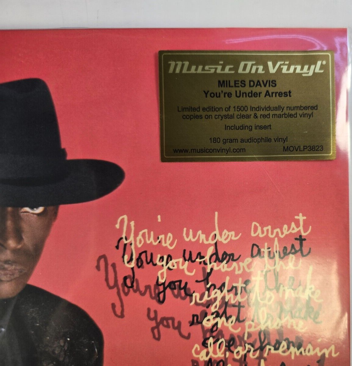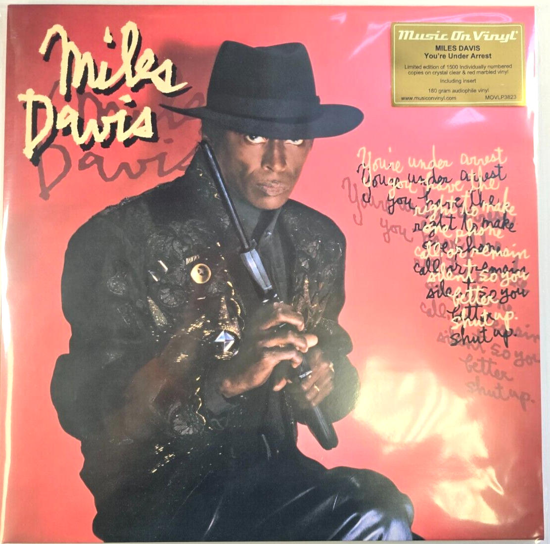 Miles Davis You're Under Arrest LP Album vinyl record limited pink numbered 180g180 gram audiohphile vinylIncluding insertFeat. cover versions of Cyndi Lauper's "Time After Time" and Michael Jackson's "Human Nature"Feat. John McLaughlin on guitarLimited edition of 1500 individually numbered copies on red & clear marbled vinylYou're Under Arrest is a 1985 album recorded by Miles Davis, presenting a mixture of pop covers (including Cyndi Lauper's "Time After Time" and Michael Jackson's "Human Nature"), and original material dealing with politics, racism, pollution and war. It is the first Davis album since On the Corner in 1972 to include electric guitarist John McLaughlin.This version comes as a limited edition of 1500 individually numbered copies on red & clear marbled vinyl.Side A1. One Phone Call/Street Scenes2. Human Nature3. Intro: MD1/Something's On Your Mind/MD24. Ms. Morrisine5. Katia PreludeSide B1. Katia2. Time After Time3. You're Under Arrest4. Medley: Jean Pierre/You're Under Arrest/Then There Were None