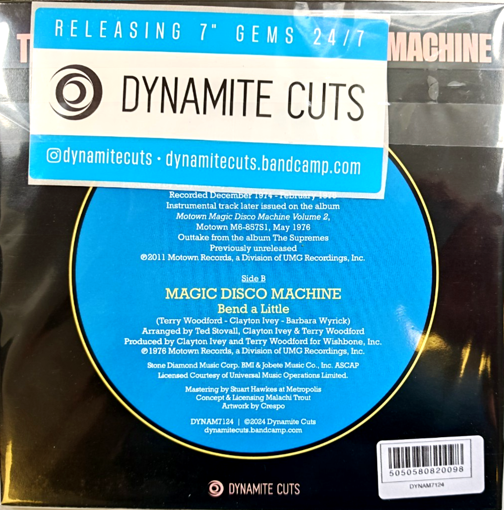 This boutique 7" release from Dynamite Cuts unearths a rare disco-soul gem from the Motown vaults. Bend A Little by The Supremes, previously unreleased on vinyl, showcases the vocal talents of Mary Wilson, Scherrie Payne, and Cindy Birdsong in a shimmering, dancefloor-ready arrangement. On the flip, Magic Disco Machine delivers a tight instrumental version, perfect for DJs and collectors alike.