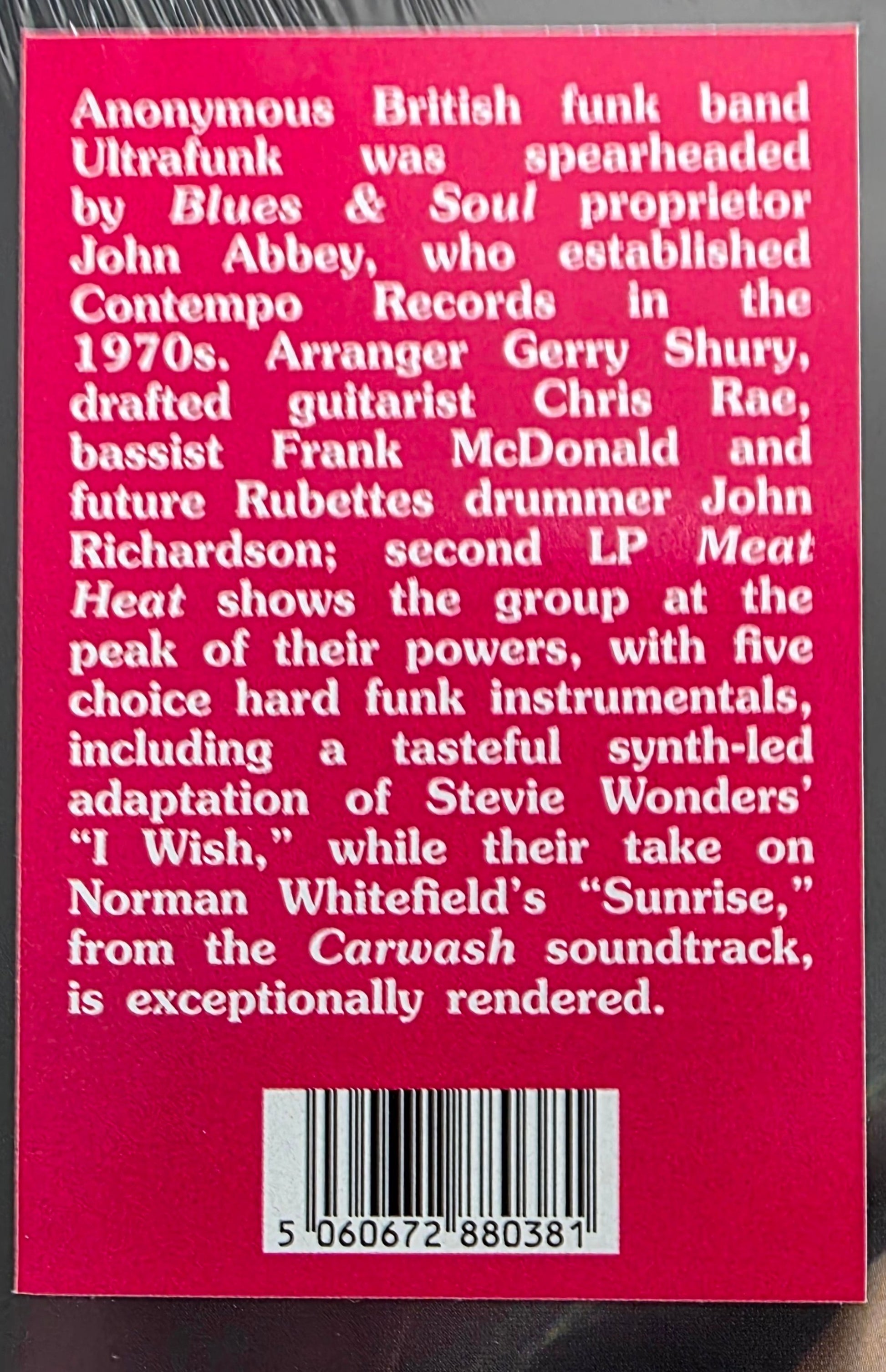 A cult UK funk instrumental from the anonymous studio outfit Ultrafunk, Meat Heat delivers deep grooves, horn-heavy arrangements, and slick covers of Stevie Wonder and Norman Whitfield. Spearheaded by Contempo label founder John Abbey and arranged by Gerry Shury and Gordon Hunte, the album channels the energy of MFSB and early disco with British precision. Reissued multiple times, including neon pink and 180g editions, it remains a crate-digger favourite.