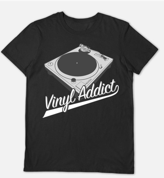 Show your wax obsession loud and proud with this Vinyl Addict T-shirt — the perfect fit for crate diggers and hi-fi junkies alike. Featuring a clean black-and-white colour scheme and a bold turntable logo front and centre.